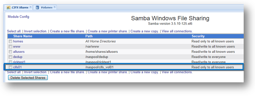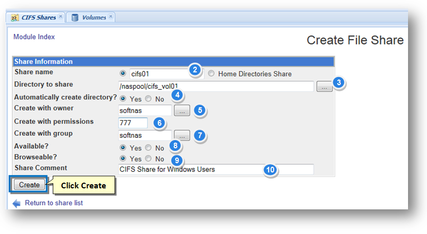 1. On the CIFS Shares panel, click the Create a New File Share link.