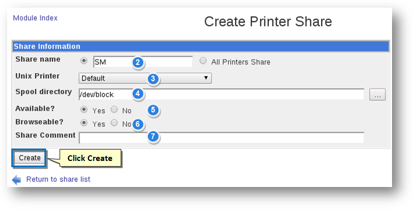 2. In the Share name field, make sure the first button is selected and enter a unique alphanumeric name for your share into the text box. This should be the same as the name of the Unix printer you select in the next step to avoid confusion. If an automatically created printer share with the same name already exists, this new one will override it.