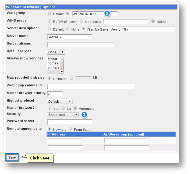 2. Set the name of the workgroup in the Workgroup field. This setting should be appropriate to your environment. It should match your Windows workgroup or domain environment.