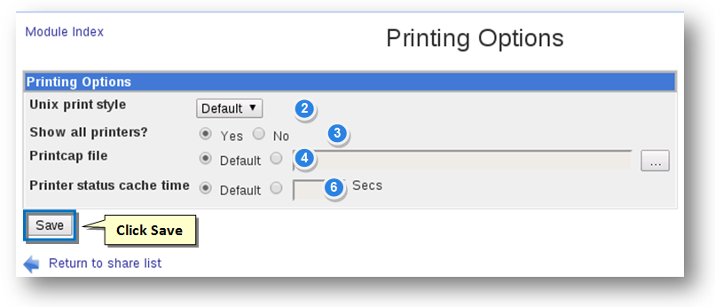 4. When the Printcap file field is set to Default, Samba will get the list of printers available on your system from the standard /etc/printcap file.