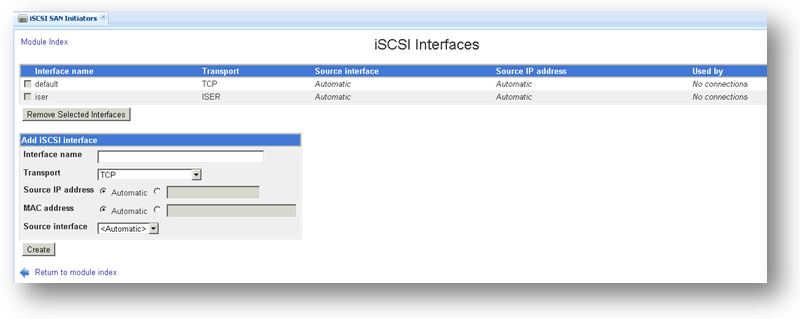 From here, you can add a new iSCSI Interface or remove an existing interface.
