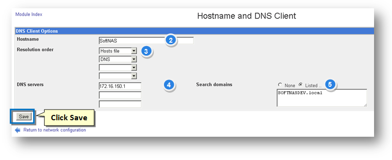 The Hostname and DNS Client module allows you to configure host name, resolution order and dns servers.