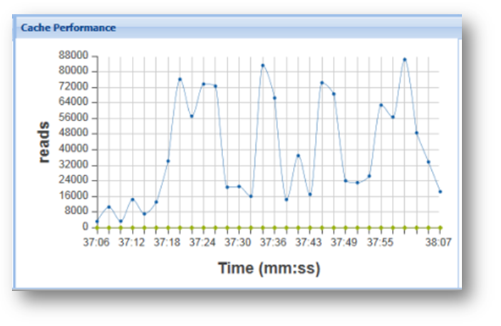 The Cache Performance chart shows the number of read operations being serviced from cache memory (instead of being read from disk). In many applications, after applications have been running for a time, the majority of reads will be serviced from cache memory instead of requiring disk read operations.