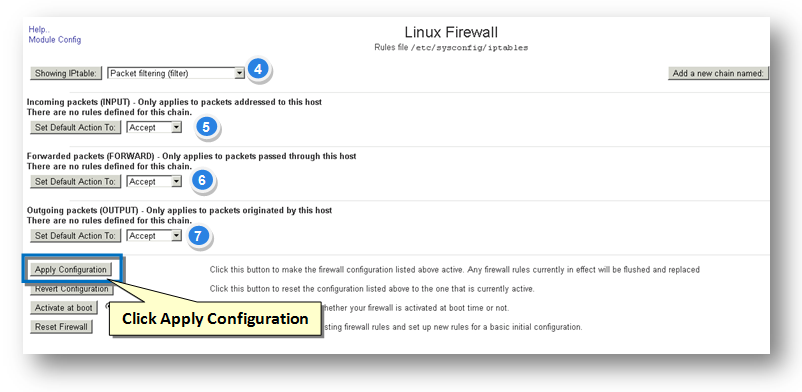 8. Click the Apply Configuration button to make the changes made to the firewall configuration active. Any firewall rules currently in effect will be flushed and replaced.