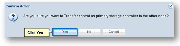 The Confirm Action message box asking you to confirm the transfer control as the primary storage controller to the other node will be displayed.