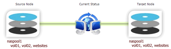 In the following example, we have a storage pool named naspool1 on both the nodes, along with three volumes: vol01, vol02 and websites. In such cases, the SnapReplicate will automatically discover the common pool named naspool1 on both nodes, along with the source pool's three volumes, and auto configure the pool and its volumes for replication.