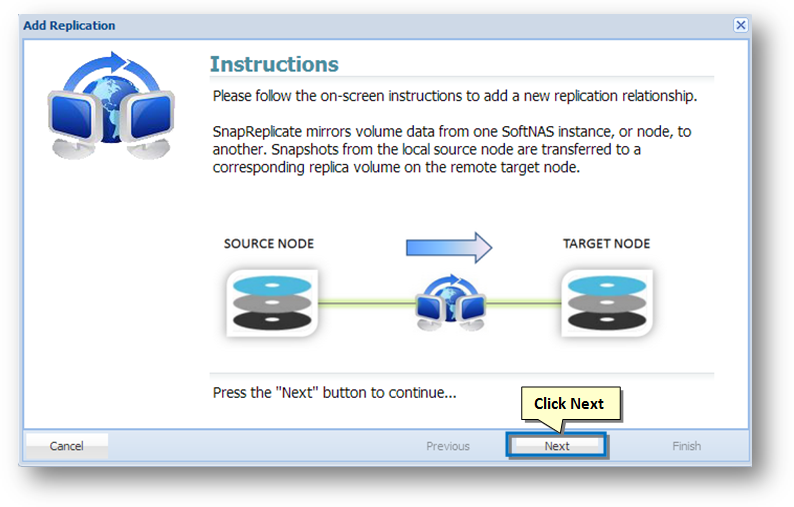 SnapReplicate™ provides a simple yet powerful means of defining a replication relationship between two SoftNAS controllers - the source node and the target node.