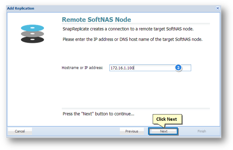 3. In the next step, enter the IP address or DNS name of the remote, target SoftNAS controller node in the Hostname or IP Address text entry box.