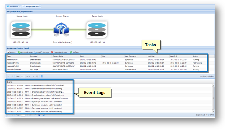 The tasks and an event log will be displayed in the SnapReplicate Control Panel section.