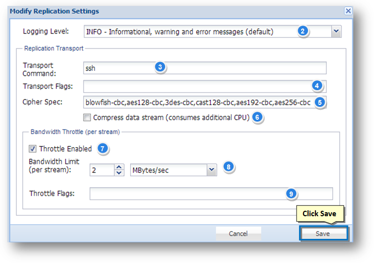 8. Specify the numeric value for the maximum bandwidth amount, per stream / volume and select the units (e.g., MBytes/sec, Kbits/sec, etc.) in the Bandwidth Limit (per stream) field.