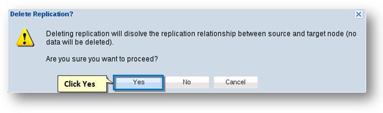 The message box asking you to confirm the dissolving of the replication relationship between the two nodes will be displayed.