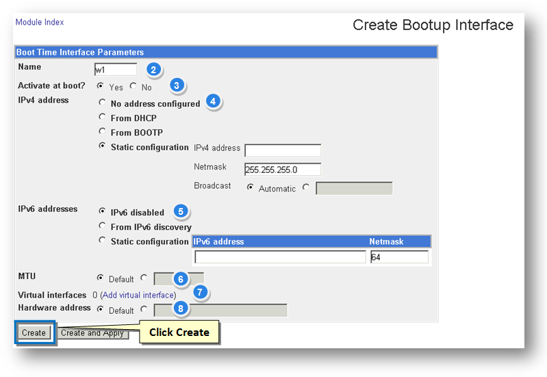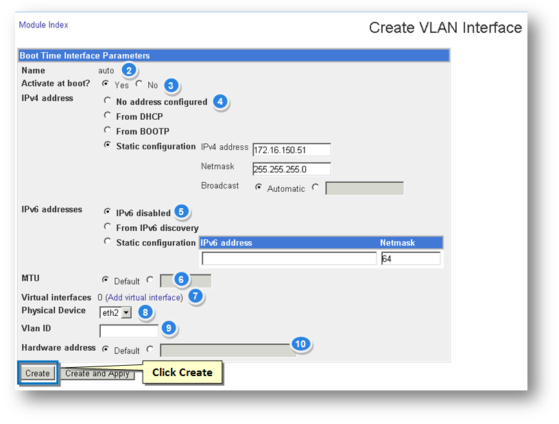 3. Specify whether you wish to activate this interface at boot time or not by choosing Yes or No option in the field.