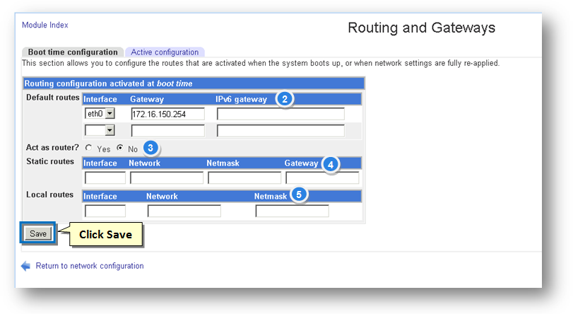 The Boot Time Configuration section allows you to configure the routes that are activated when the system boots up or when the network settings are fully re-applied.