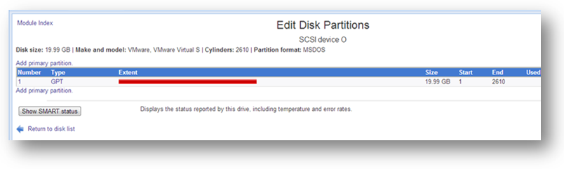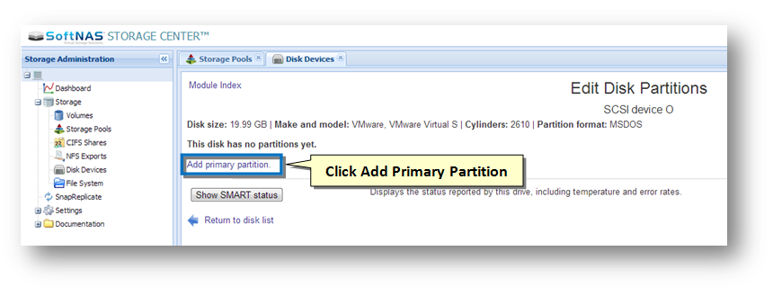 Note: If you are installing for the first time, all of your disk devices will show no partitions (except SCSI device A, which has the 30 GB disk that SoftNAS was installed on).