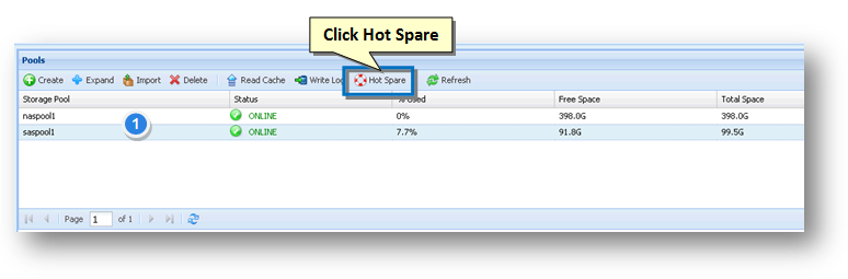 1. Select the pool to which you wish to add hot spare in the Pools list.