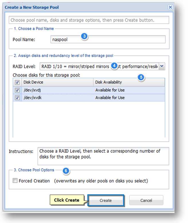 Note: If any of the disk devices you choose have been used as a part of another storage pool in the past (e.g., one that was deleted), you must use the Forced Creation option to overwrite the previous data in order to use the disk in a different pool (a precaution to prevent accidental data loss).