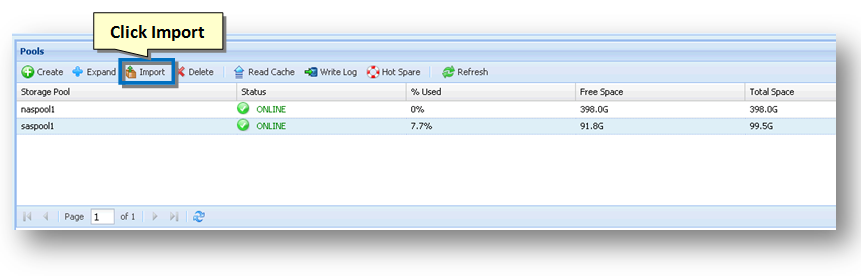 Note: In the unlikely event you want to recover a deleted pool (immediately after deletion, use the Import button to import the deleted pool.