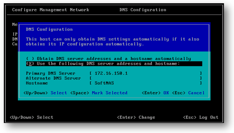 16. Back on the Configure Management Network screen, select the DNS Configuration option.