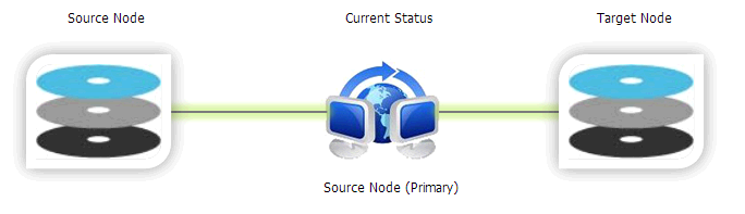 In the following example, you can see a source node and a target node. The data is always replicated from the source to the target. The Current Status shows the replication active symbol (the two computers with blue arrow), along with the green transfer indicator.