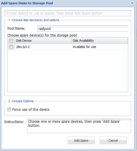 Note: If any of the disk devices you choose have been used as a part of another storage pool in the past (e.g., one that was deleted), you must use the Forced Creation option to overwrite the previous data in order to use the disk in a different pool (a precaution to prevent accidental data loss).